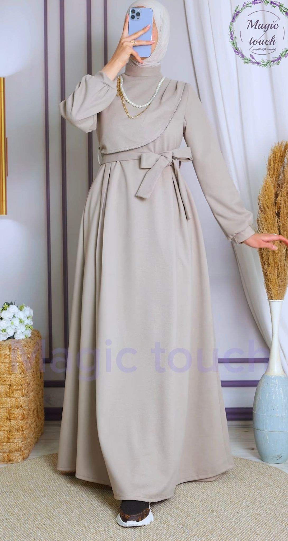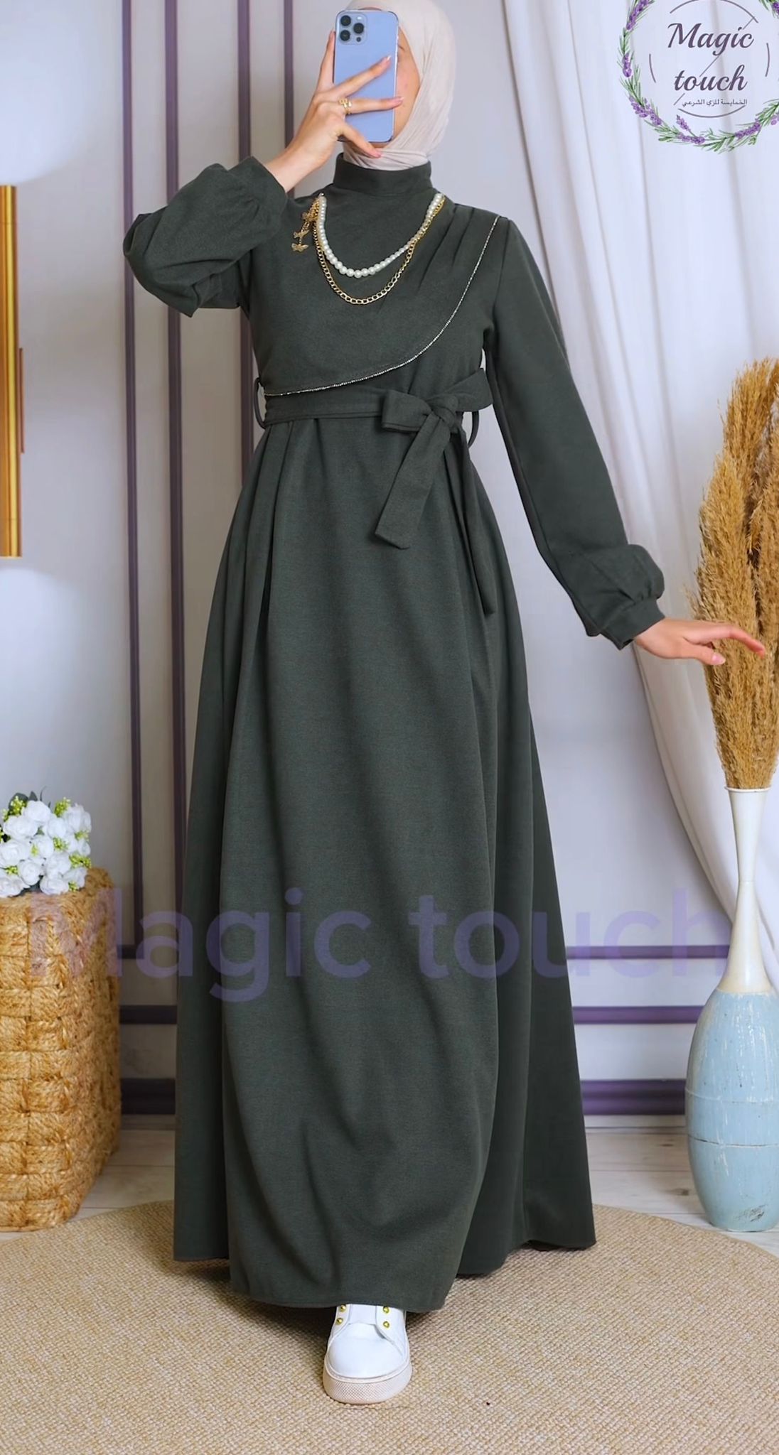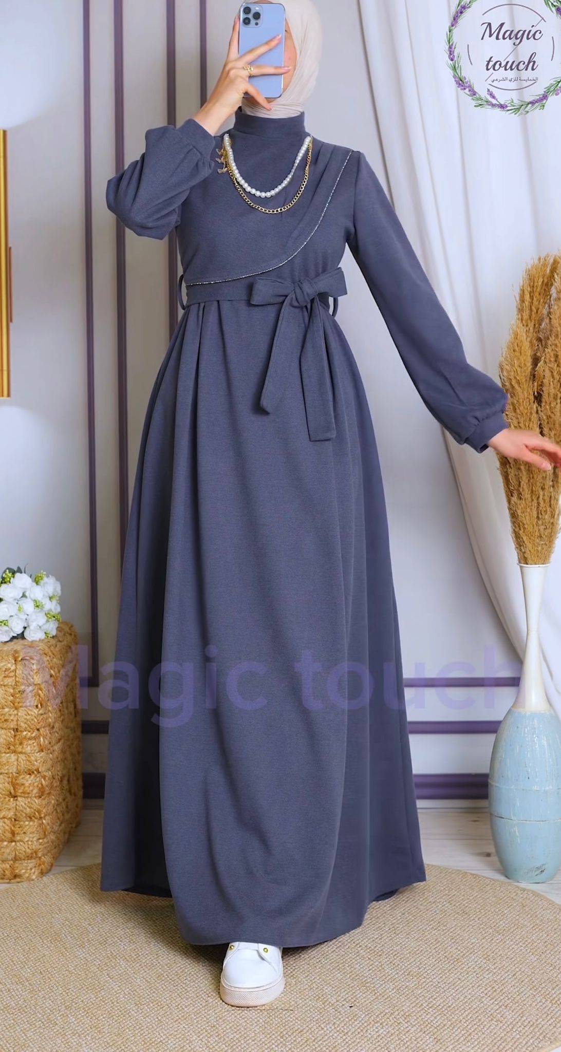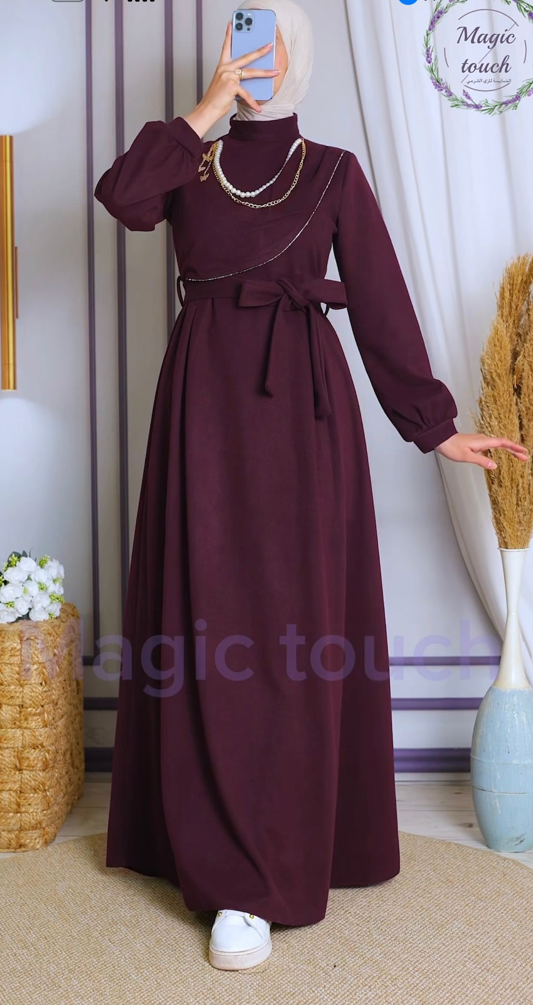 فستان جوخ مصوف ناعم مميز يحتوي على سترس صدر انيق بالاضافة الى سنسال ، مع حزام ربط، سحاب خلفي ، طول القطعة ١٤٧سم