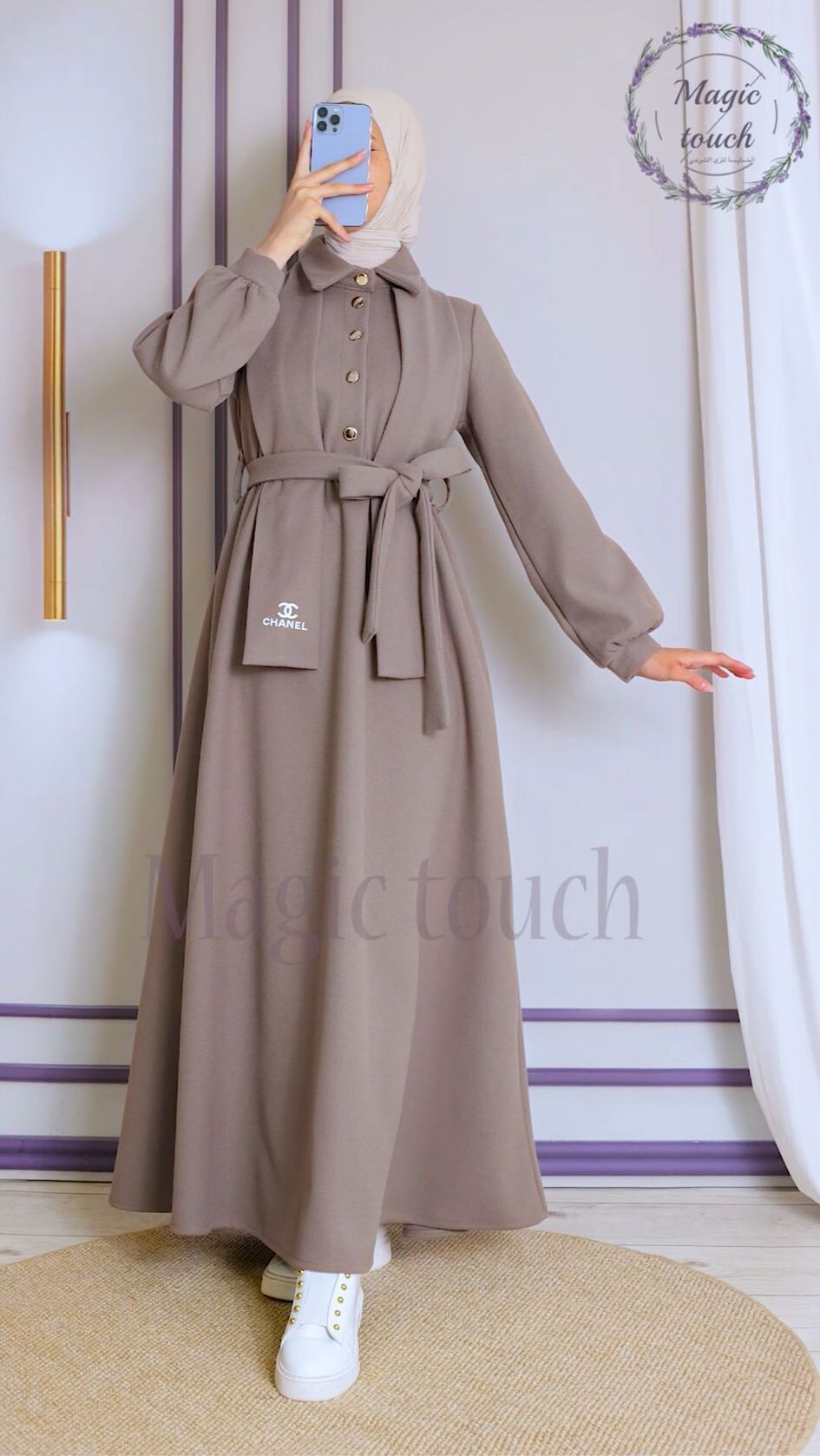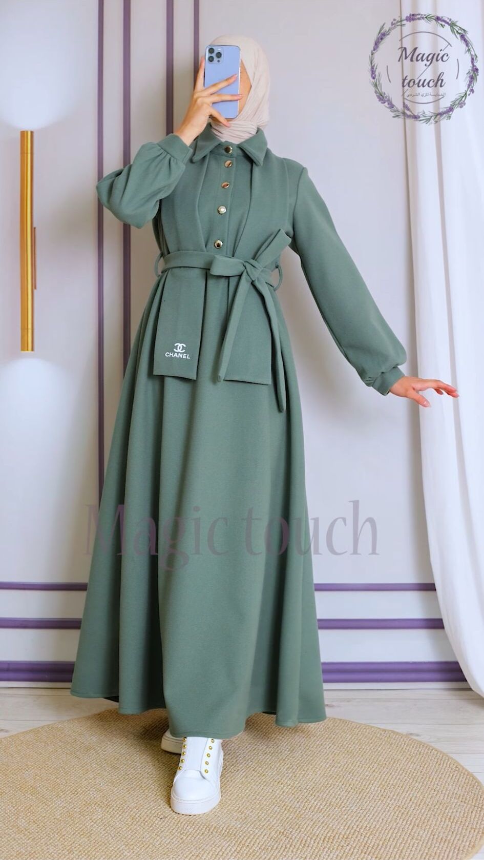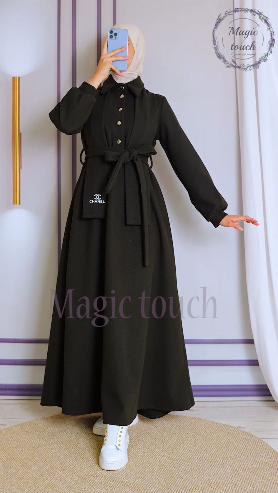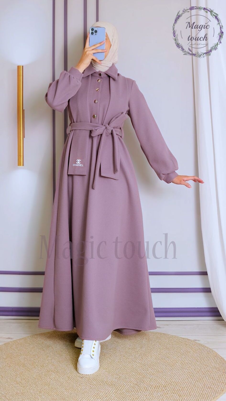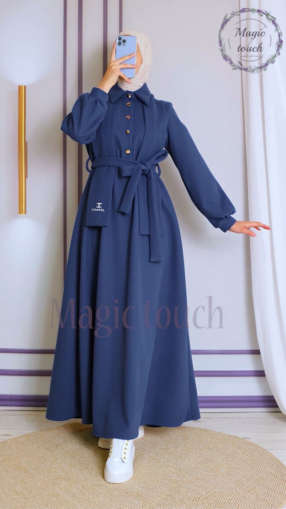 فستان جوخ انيق ، بمغيط على الخصر ،وحزام وسكارف من نفس الخامة مطبوع عليها شعار الشانيل، مع ازرار ذهبية ، طول١٤٥سم