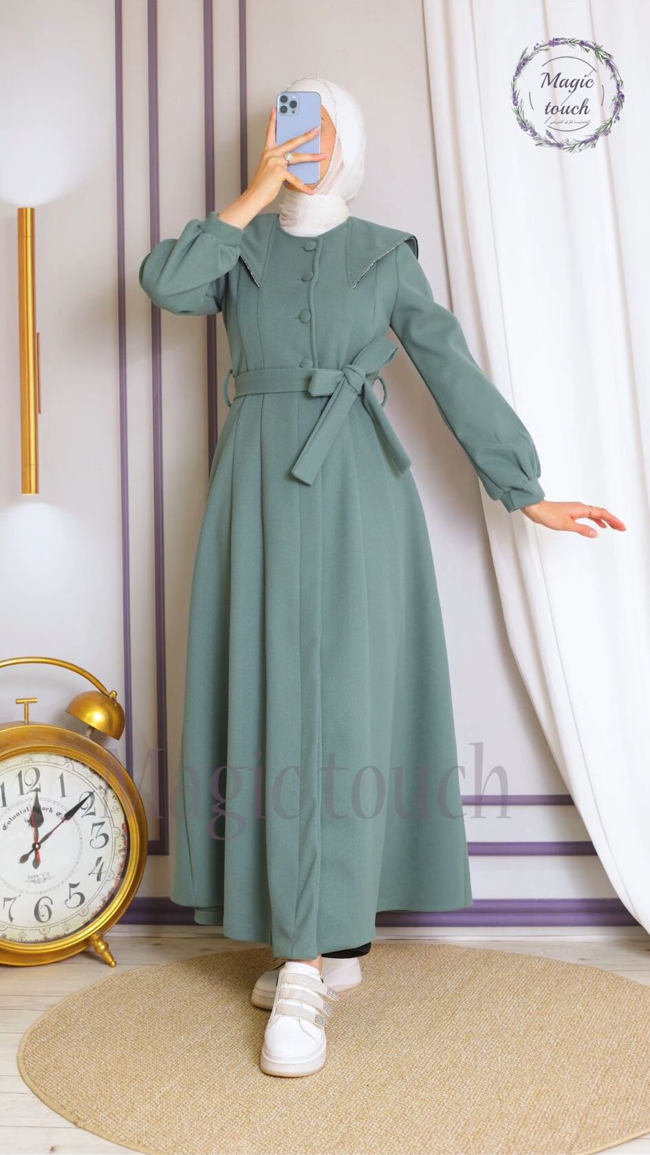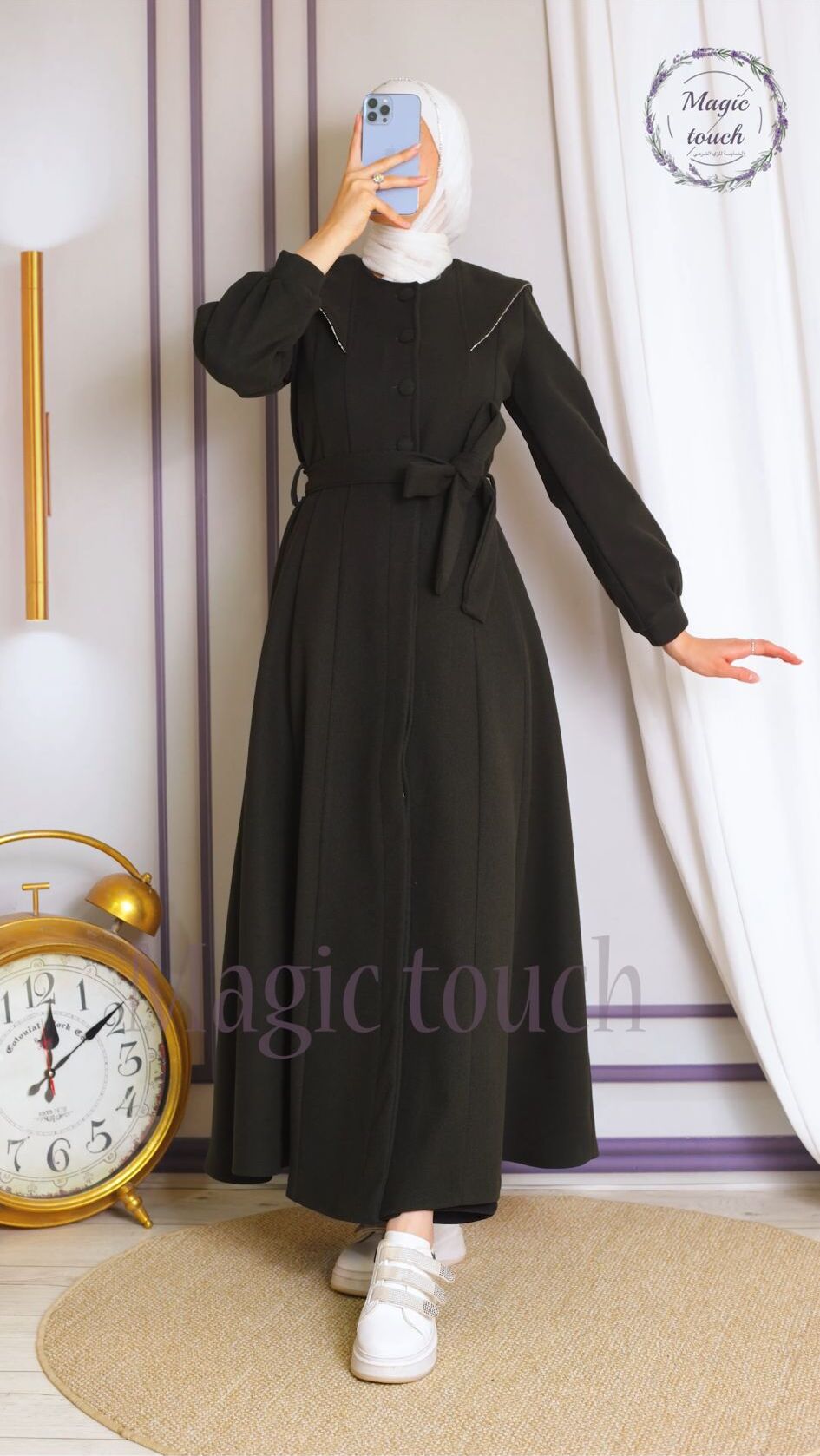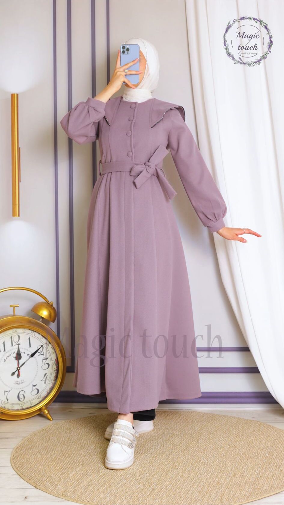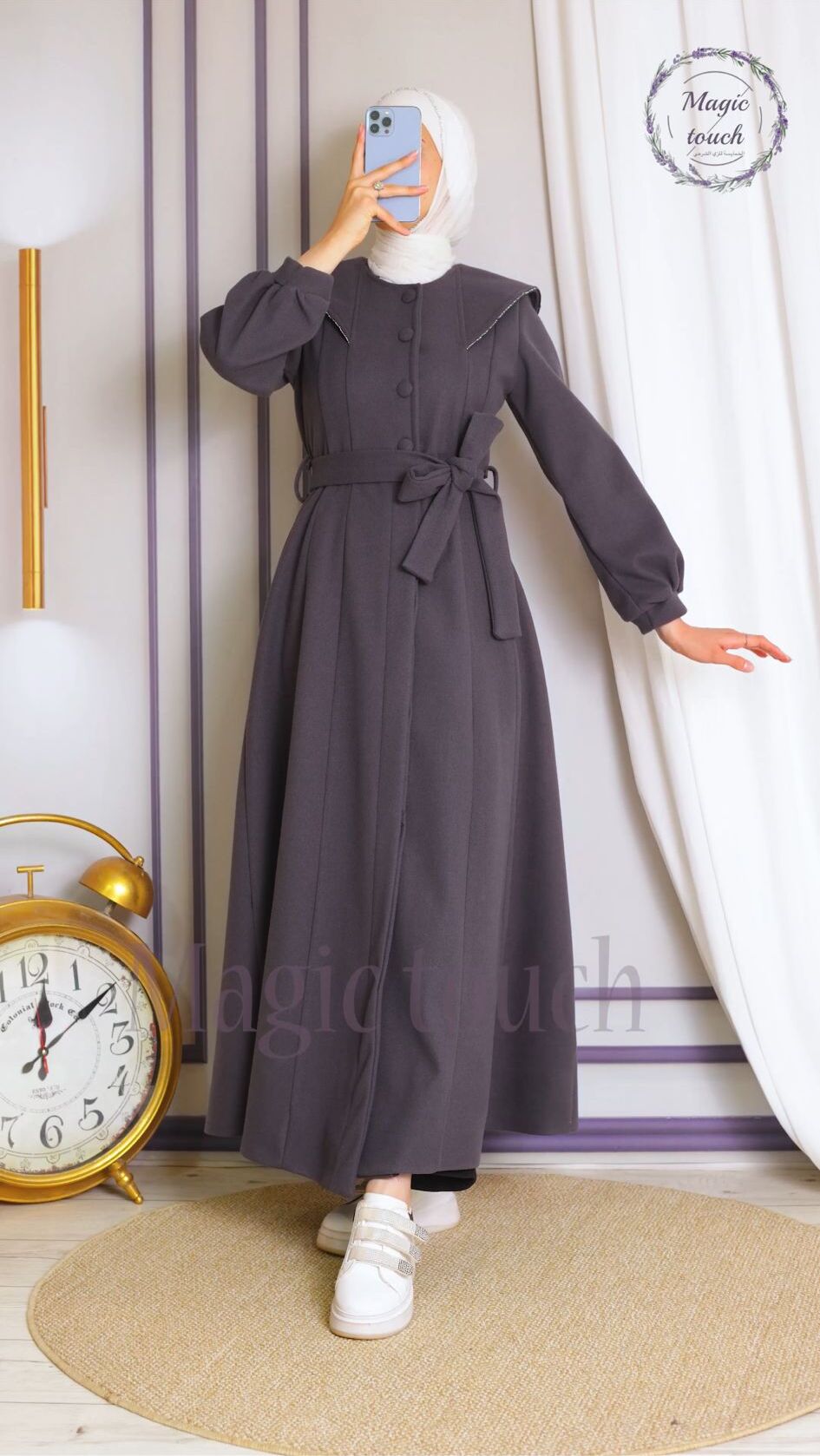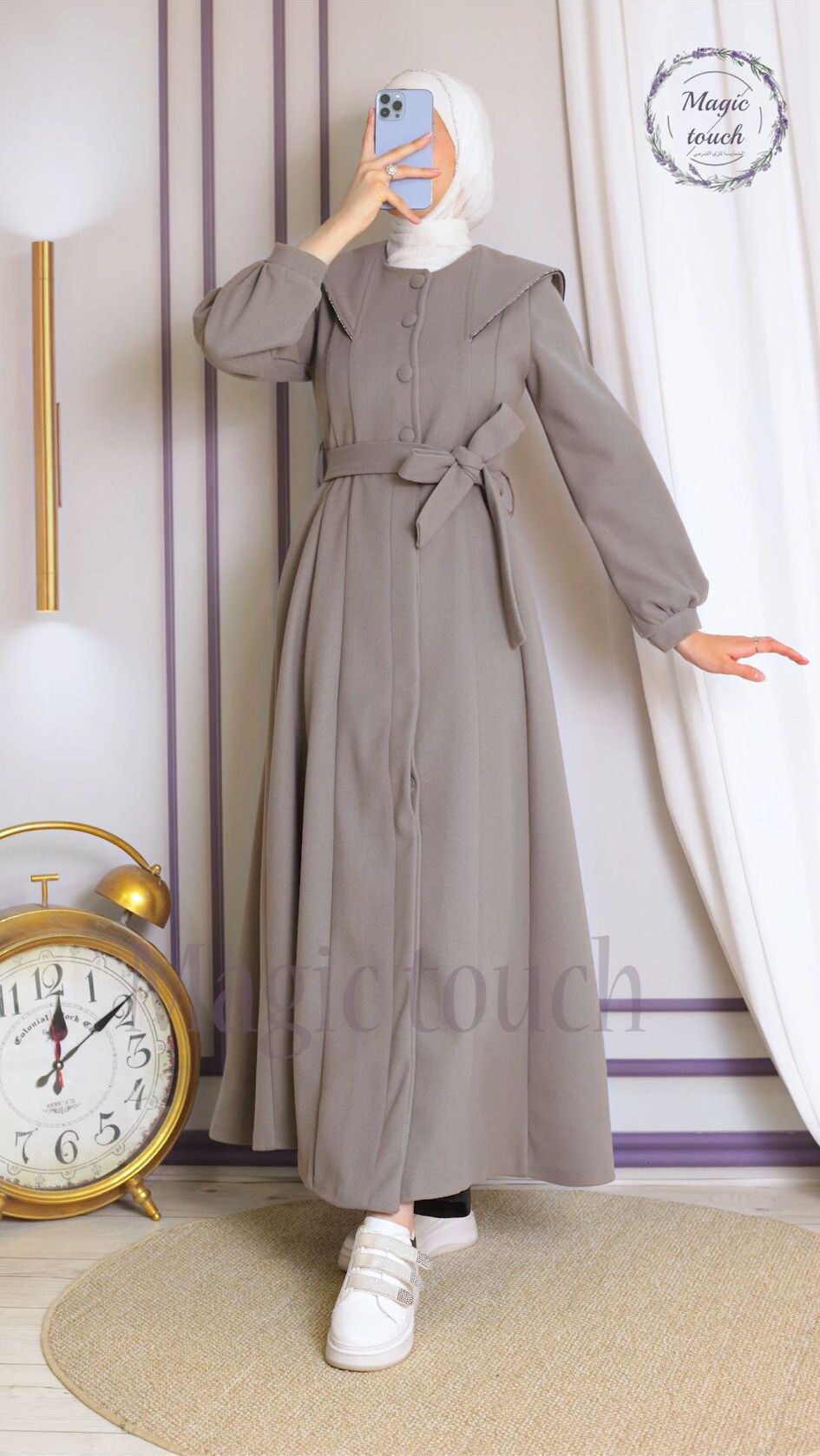 ترنش جوخ سادة ناعم طول ١٤٠ سم ، يحتوي على طربوش محاط بالسترس الناعم ، وحزام على الخصر وازرار للنهاية
